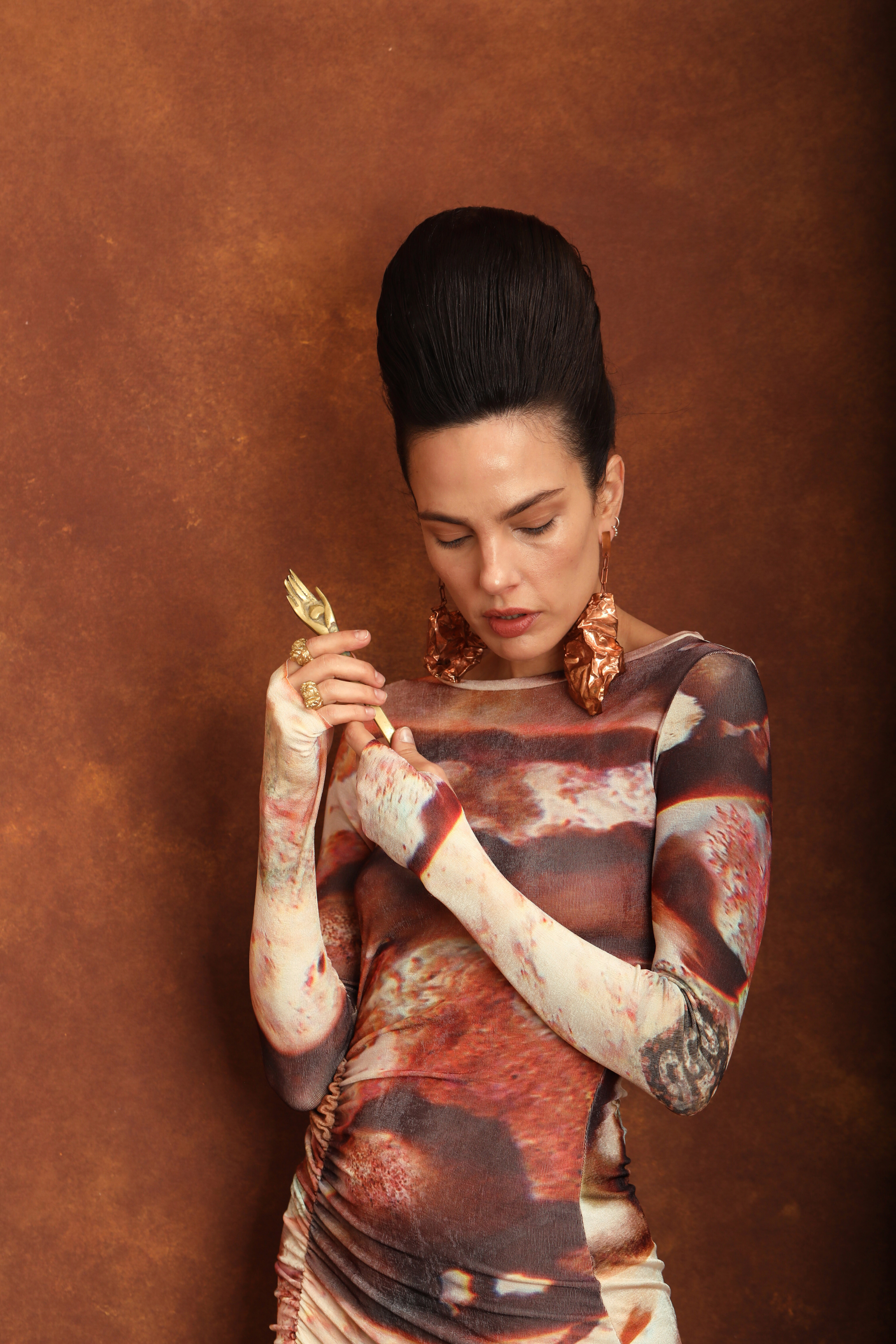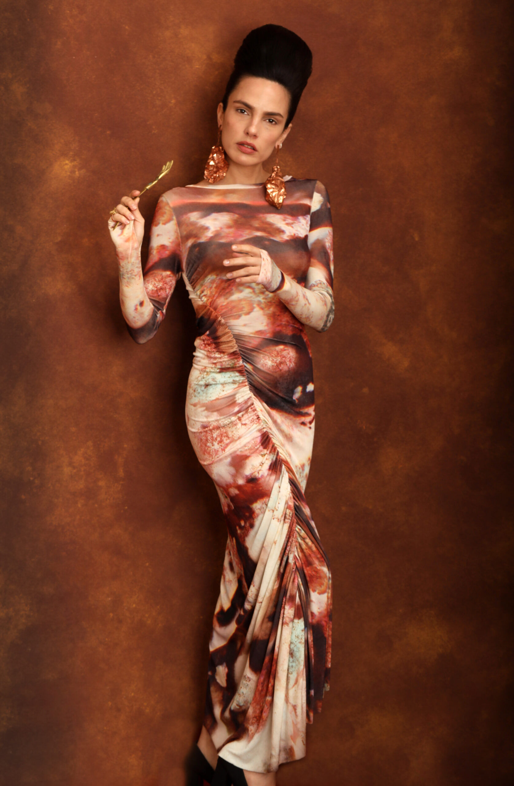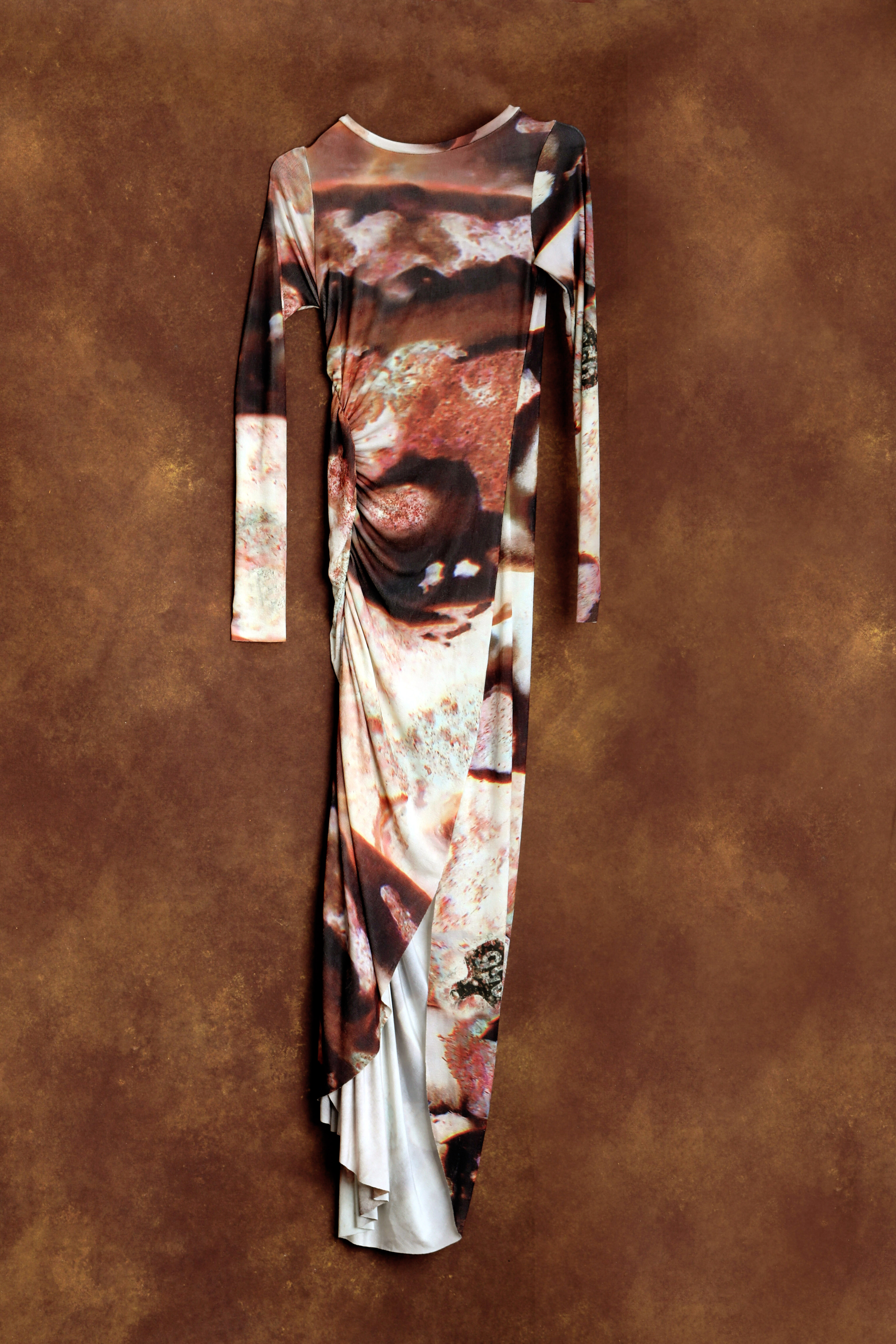 Alucinante vestido largo con un drapeado que comienza en un costado e ingresa al centro de la prenda, balanceando el otro lado con un tajo sensual. Las mangas son largas e incluyen un orificio para el dedo pulgar.